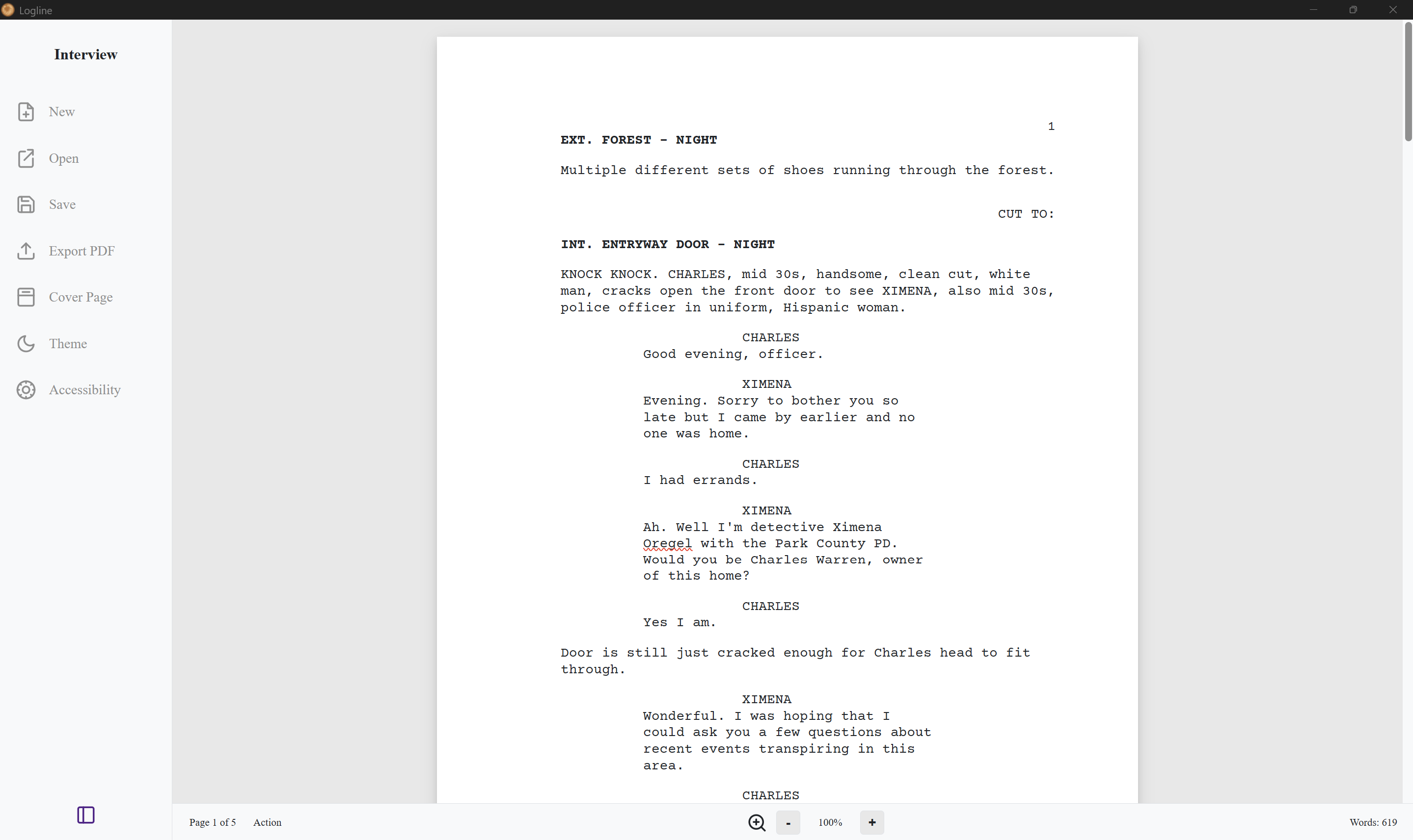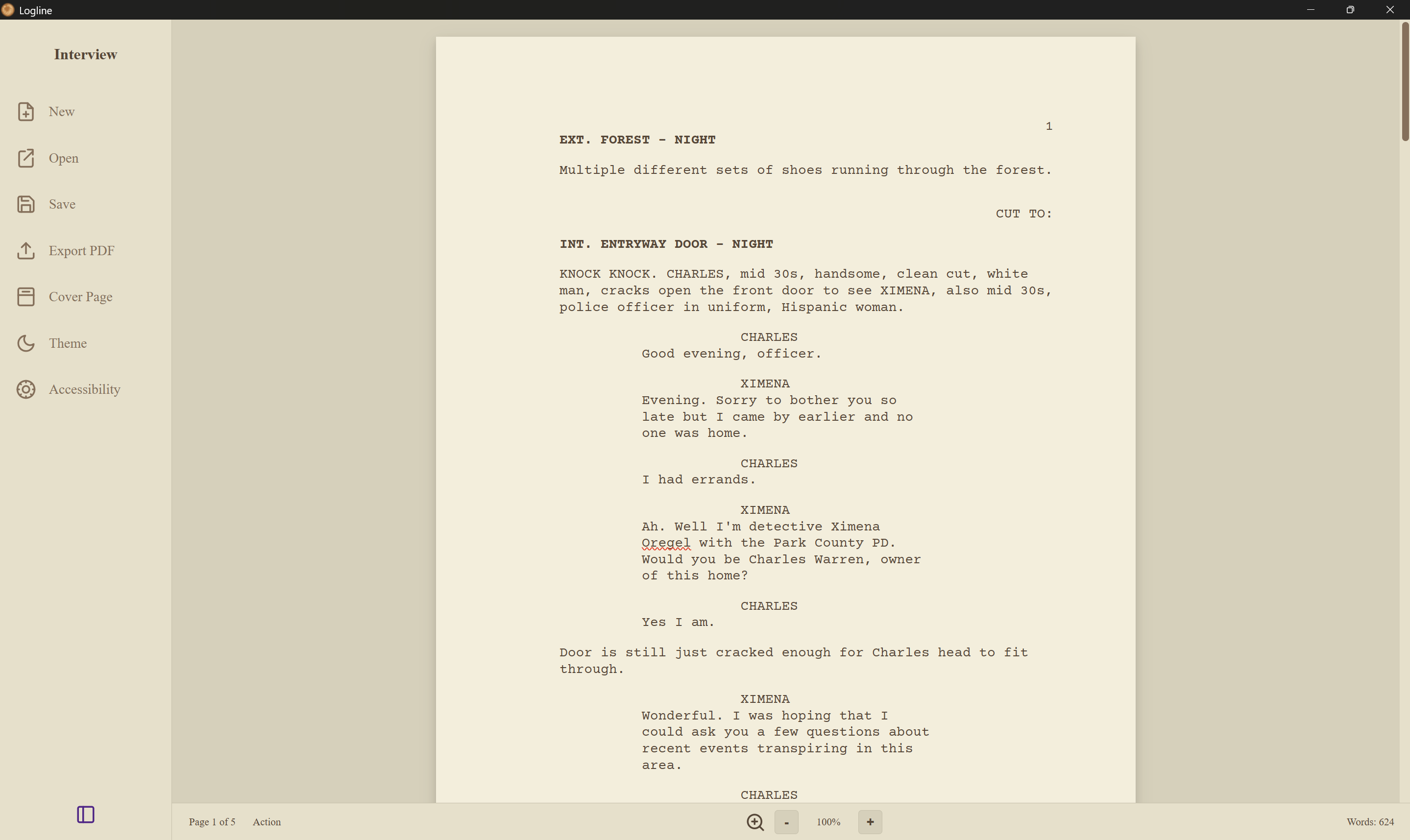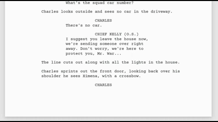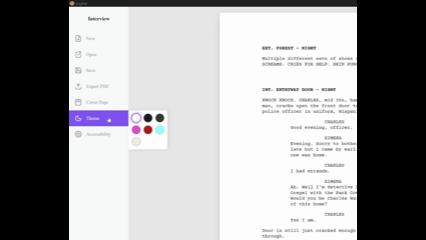 Auto Formatting - I want the software to never get in the way of your flow. So Scene Headings flow directly into Action, Character Name flows directly into Dialogue. Enter is the key. Hit it twice and an element selection menu appears allowing you to quickly switch to another element. (Newly uploaded GIFs seem to be broken on itch right now, working on a new solution to show functionality)